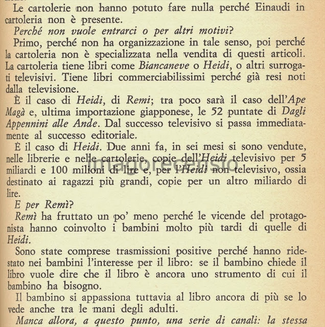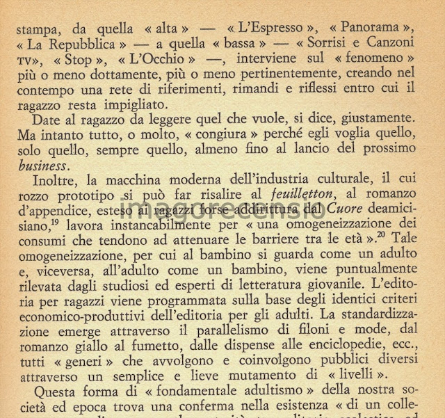 A pagina 12 la prima citazione, in cui si parla dei libri per ragazzi e del rapporto coi mezzi di comunicazione di massa, sfiorando appena il tema dell'interesse dei quotidiani per il nuovo fenomeno dei cartoni animati giapponesi.