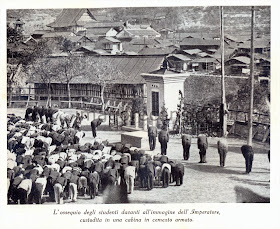 Trovo che questa sia in assoluto la foto più importante del libro, oltre che la più drammatica. Il fanatismo di un intero popolo che s'inchina al cospetto di una semplice immagine, neppure mostrata, in quanto l'effige dell'imperatore restava celata agli sguardi umani, portò il Giappone quasi alla totale distruzione. Provocando milioni di morti nelle popolazioni civili delle nazioni conquistate. E questa era una scuola...