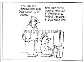 Sempre sul medesimo numero dell'Unità c'è una vignetta di Altan che io ho interpretato in senso pro Goldrake, o almeno contrario alle critiche. In quanto se per un adulto è da rimbambiti guardare robot tutti uguali, per un bambino è lo stesso guardare politici tutti ugali.