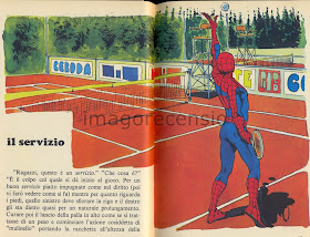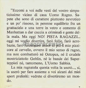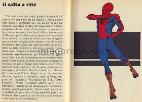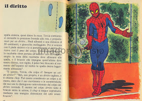Oltre al fiocchetto sempre ben in vista(...) nella pagina di destra si vede pure l'Uomo Ragno in posa prima del salto.  Ci sarebbe da indignarsi, se non avessimo già casi più gravi (direi nani) per farlo.