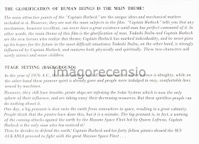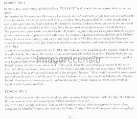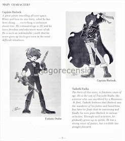 Ecco un opusculo informativo della Toei Animation sul pirata spaziale, ora di nuovo in auge grazie al film presentato al recente Festival del cinema di Venezia. Essendo completamente in inglese ipotizzo fosse stato pubblicato per qualche fiera dell'animazione in Giappone, allo scopo di vendere la serie all'estero. Infatti è descritta brevemente la trama della serie, le caratterisitiche dei personaggi, la sinossi delle prime puntate, sono presenti alcuni disegni di astronavi e personaggi.
