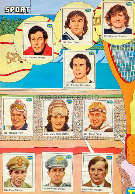 Le figurine di questo album non erano autoadesive, ma si dovevano incollare a mano, la qual cosa me lo fece immediatamente detestare, e quindi ai tempi non lo terminai, anzi, neanche lo iniziai. L'ho riscoperto negli ultimi anni comprandolo ad una fiera, e devo dire che il suo valore nostalgico (in senso buono) è molto forte. Pur essendo composto solo da volti disegnati (immagino da una base fotografica), quindi nessun testo o dato riguardo ai tantissimi personaggi presenti (circa 380 tra attori/attrici, personaggi tv, del teatro, dei cartoni animati e giornalisti), prende il sopravvento il valore "storico" televisivo: ci sono i personaggi degli anni 70 (molti dei quali preseguirono la carriera anche negli anni 80, ed una minoranza sono "sopravvissuti" fino ai gorni nostri).