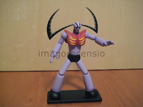 Sesta uscita, e per ora tutti i modellini mi sono arrivati integri (a parte il Mazinga Z bi-mancino... ). Questo Garada K7 trovo che sia particolarmente delicato nelle sue due corna/falci, attaccate alla testa con poco materiale, comunque tutto ok. La posa di Garada K7 non è brutta, come sempre un po' particolare, poco dinamica, quasi fosse stato immortalato in una attività differente dal devastare Tokyo, tipo quando si è al buio e si cerca l'interruttore della luce. La colorazione del mio modelino è accettabile, senza sbavature evidenti, è anche vero che quasi tutto il modellino è fuxia.