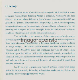 Questo catalogo bilingue (giapponese/inglese) sugli shojo manga e i suoi autori/autrici è stato pubblicato nel 2008 a fronte di due distinte mostre avvenute in Giappone e nel nord america (se ho compreso bene lo scritto in inglese...). Da quello che mi è parso di capire la prima parte della mostra è stata proposta negli Usa e in Canada, ed è terminata intorno al 2007, mentre le mostre in Giappone sono avvenute nel 2008. Il catalogo introduce il lettore alle opere di 23 autori di shojo manga, presentati con schede monografiche di due pagine, più un breve riassunto della loro carriera. Sono presenti alcuni scritti che analizzano il fenomeno "shojo manga" da diversi punti di vista, l'opera è conclusa con la proposizione di una breve intervista a 11 dei 23 artisti presentati.