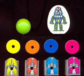 Per esempio la trottola blu che appoggio sulla scatola, e che dovrà essere posta al centro del tabellone di gioco, dovrebbe essere una astronave delle mazoniane...