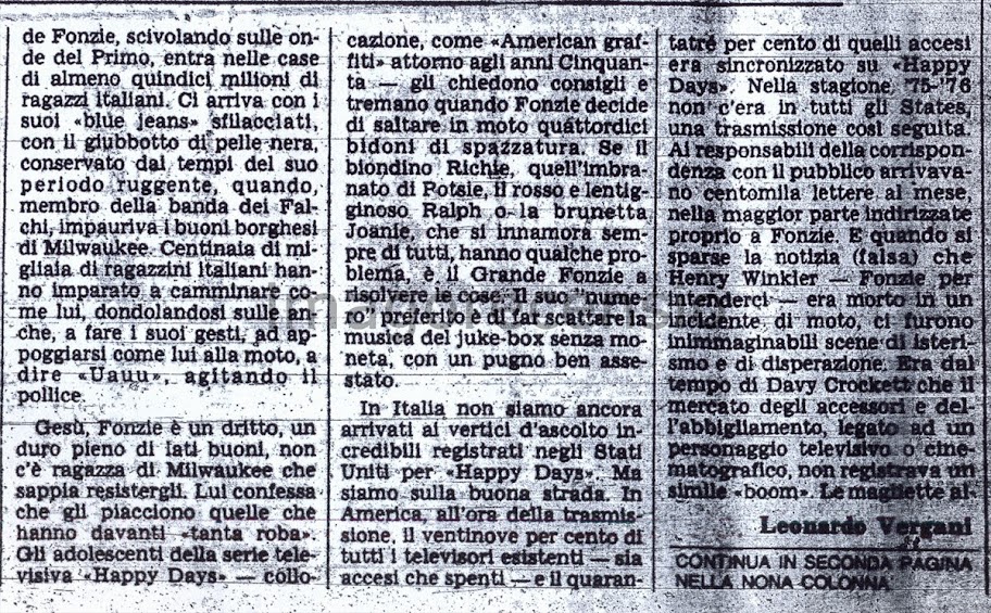 Il 12 gennaio 1979 termina la seconda parte di Goldrake, ed il 13 gennaio sempre il Corriere della Sera esce in prima pagina con un articolo di Leonardo Vergani che solo in minima parte riguarda Actarus e soci, però già si nota l'accenno alle polemiche secondo cui la serie robotica giapponese "perseguirebbe l'ideologia dell'annientamento", per fortuna c'è un altro eroe negativo su cui sfogarsi: Fonzie (che personalmente ho sempre detestato).