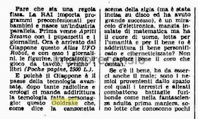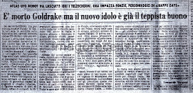 Fino ad ora si può annoverare un solo articolo di analisi su Goldrake, quello positivo di Giulia Borgese il 9 maggio 1978 sul Corriere della Sera (presentato nel post sull'esordio di goldrake in tv), ma il 6 gennaio 1979, sempre sul Corriere della Sera, il giornalista Luca Goldoni in seconda pagina torna sul robot giapponese, ed anche questa volta il giudizio è positivo!