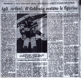Quasi a voler smentire la nostra memoria (ed anche i tanti articoli di condanna presenti nell'Emeroteca Anime di questo blog) inizialmente Goldrake ebbe stampa positiva. Questo articolo di Luca Goldoni anticipa di un solo giorno il famigerato articolo su La Repubblica di Silverio Corvisieri che diede il la alla demonizzazione di Goldrake.