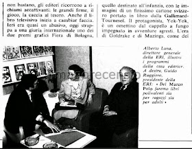 Nell'aprile del 1981 si svolgeva l'annuale Fiera Internazionale del Libro per Ragazzi a Bologna, dove la casa editrice made in Rai, la Eri, presentava le pubblicazioni sullo sceneggiato di "Marco Polo". La Eri aveva pubblicato, e venduto, una caterva di libri su Goldrake e Mazinga, facendo una montagna di utili, ma la riconoscenza non è di questo mondo, e i dirigenti Rai pare non vedessero l'ora che qualcosa di italico potesse sostituire il successo nipponico.