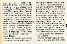 Anche "Il Giornalino", che non mi pare dedicasse grande spazio ai cartoni animati giapponesi, nell'autunno del 78 dovette piegarsi un minimo al successo di Atlas Ufo Robot, dedicando al film "Mazinga contro gli Ufo Robot" ben due pagine. Ovviamente il film faceva parte di quegli obbrobri italici creati spezzettando i mediometraggi Toei sui robottoni allo scopo di creare ex novo un film con una nuova ed inverosimile trama: Film di montaggio