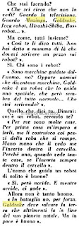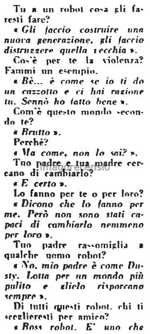 L'articolo della Rienzi è diviso in due parti, nella prima c'è un qualche tipo di introduzione al significato della parola robot e alla sua presenza nellain narrativa, con analisi sul rapporto bambini e televisione. Nel totale un articolo tra il neutro e l'inutile.