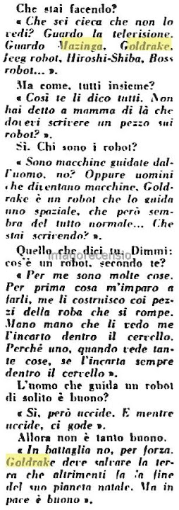 Ogni tanto i giornalisti avevano la bella idea di lasciare esprimere direttamente i bambini sul fenomeno Goldrake e soci, invece di cacciar loro in bocca frasi non pronunciate o interpretare i loro pensieri. Non che la testimonianza del mio coetaneo romano sia esente da critiche, però, alla fine, dimostra che non eravamo poi tanto lobotomizzati dai "cartoni animati giapponesi", un minimo di capacità di ragionamento l'avevamo conservata...