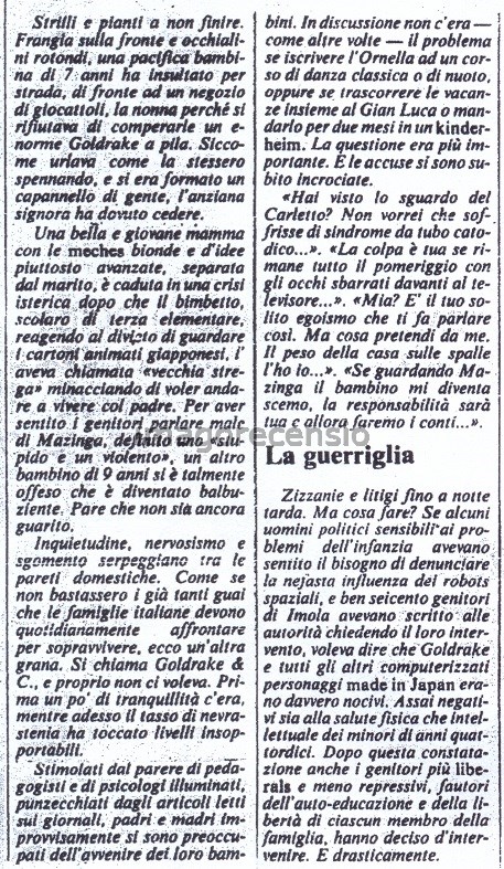 Anche questo è uno dei tanti articoli che dimostra quanto Goldrake & C. erano diventati protagonisti delle notizie giornalistiche, tanto da essere usati per fare polemica con gli avversari ideologici. Bisogna considerare anche che l'articolo campeggiava a pagina 5 del quotidiano, che mi pare di aver capito (consultandone più e più settimane) ospitasse le gli articoli sulla cultura, quelli che negli altri quotidiani erano in "terza pagina" (magari ho interpretato male il tipo di impaginazione de Il Giornale).